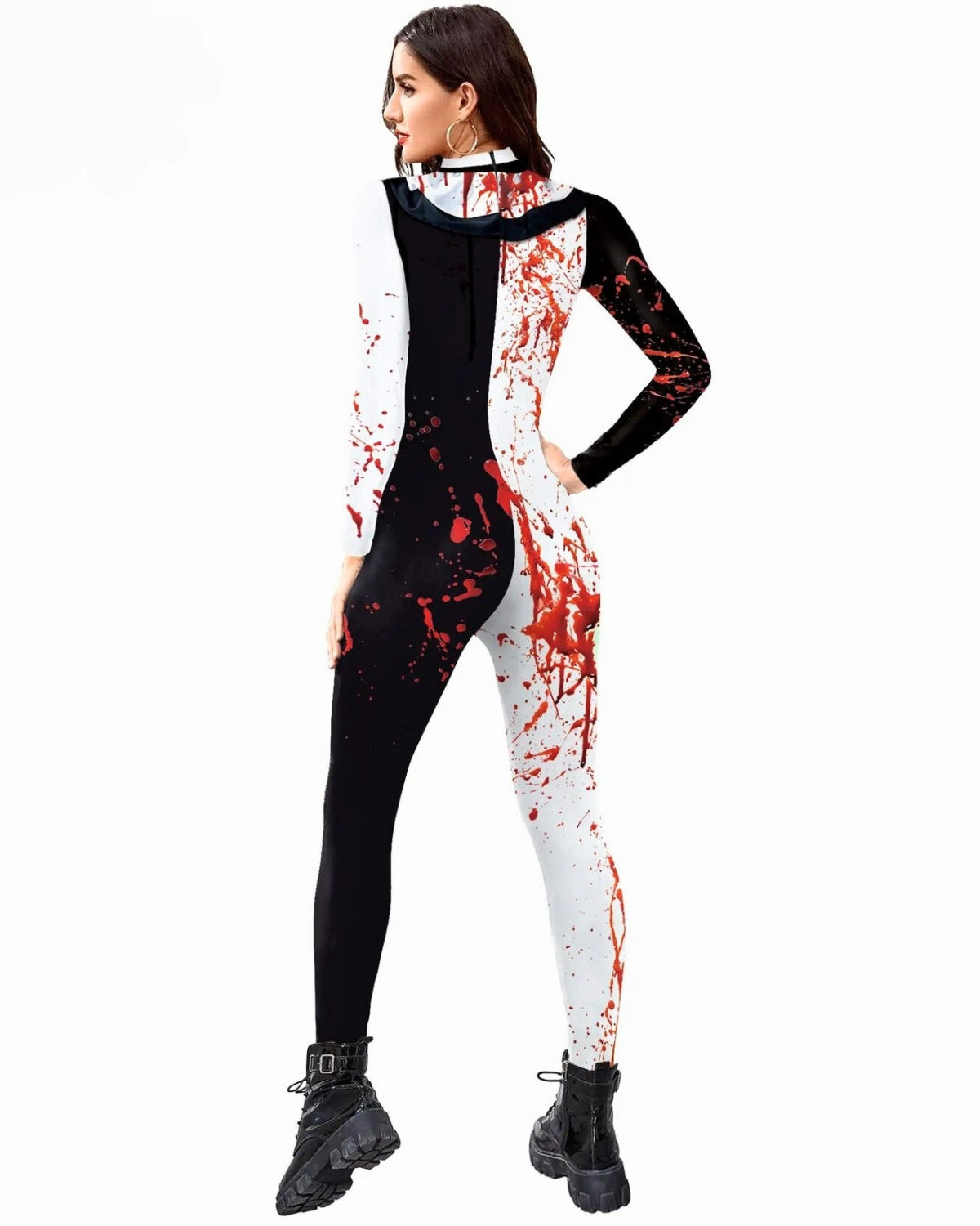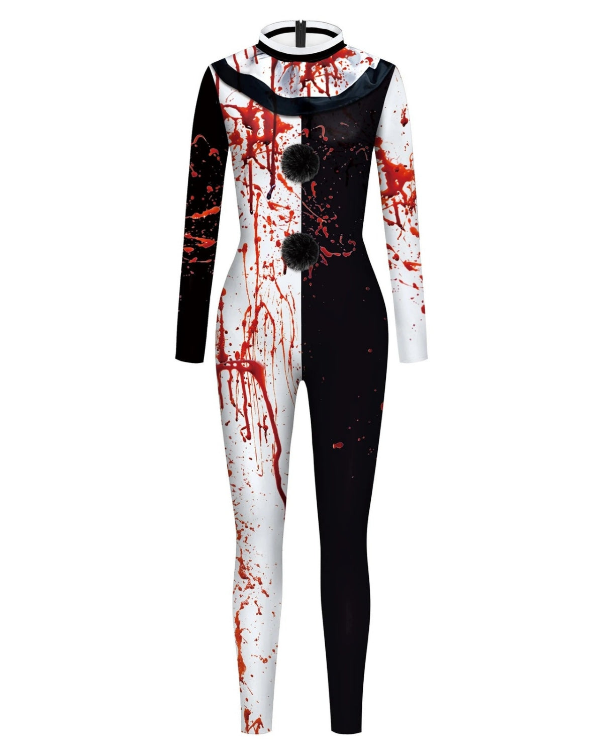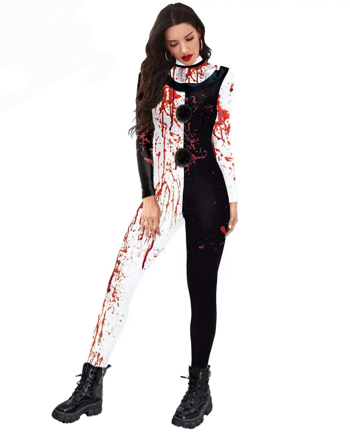 The Sinister Clown Halloween Costume blends horror and allure in a skin-tight bodysuit drenched in blood-splatter print.
